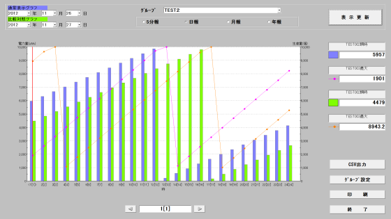 ENGChart10はEasyReport10で集計されているエネルギーデータ(棒グラフ)や生産データ(ポイント線)